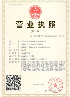江蘇三毛教儀成套設(shè)備有限公司是一家集設(shè)計(jì)、生產(chǎn)、銷(xiāo)售、售后為一體的大型制造企業(yè)。坐落于風(fēng)景秀麗的花木之鄉(xiāng)、全國(guó)經(jīng)濟(jì)百?gòu)?qiáng)縣、國(guó)家級(jí)經(jīng)濟(jì)開(kāi)發(fā)區(qū)沭陽(yáng)縣永嘉路。